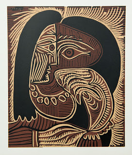 The one modern artist above all who demonstrated how printmaking could be used as a powerful and independent medium in its own right was Picasso. As a fellow Spaniard he was very aware of Goya's use of print, and is perhaps best known for the Vollard Suite of etchings (above). He creates a wide range of images including the Battle of Love, The Sculptor’s Studio, Rembrandt, the Minotaur, the Blind Minotaur and of course, portraits of Vollard, the man who commissioned him. The images show Picasso exploring a full range of etching techniques; sugar lift, dry point, soft and hard ground, aquatint, burnishing as well as variations in plate wiping techniques designed to make full use of the ink quality when printing. As well as etching he also took to the humble lino cut and produced some very powerful images.